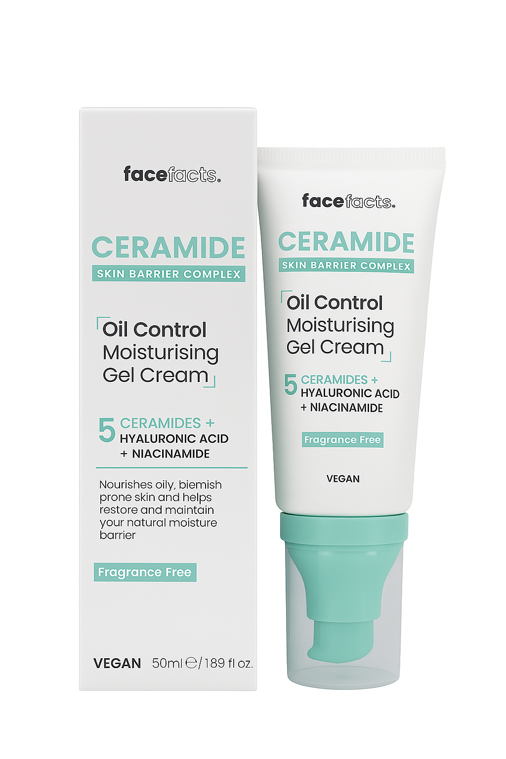 Face Facts Ceramide Oil Control Moisturising Gel Cream (50ml) is a lightweight, oil-free moisturizer designed for oily, combination, and acne-prone skin, combining 5 ceramides, niacinamide, and hyaluronic acid. It provides hydration while controlling excess sebum, strengthening the skin barrier, and providing a matte, shine-free finish. This non-comedogenic formula absorbs quickly and acts as a suitable base for makeup.